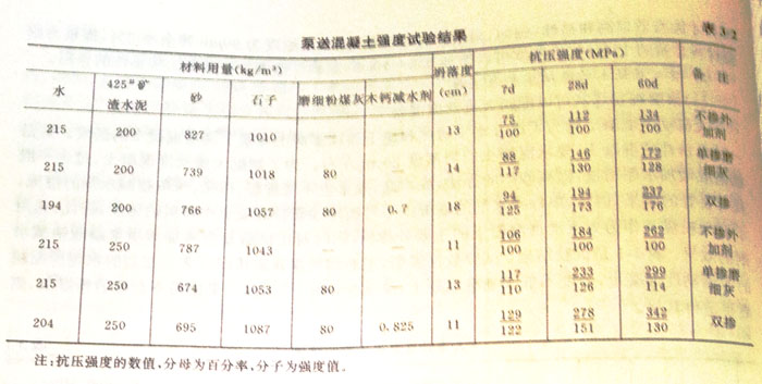 可泵性主要決定于混凝土與管壁之間的摩擦力。由于低標號混凝土的水泥用量少,可泵性差,因此,過去規(guī)定C15以下的混凝土不得泵送。可是摻如粉煤灰和減水機劑后,可使混凝土在不增加水泥的情況下仍能獲得良好的可泵性。在寶電工程中,C2.5、C5和C15的混凝土在300m水平硬管輸送時也沒有發(fā)生堵塞現(xiàn)在。表3—3是低標號粉煤灰泵送混凝土的施工實例。