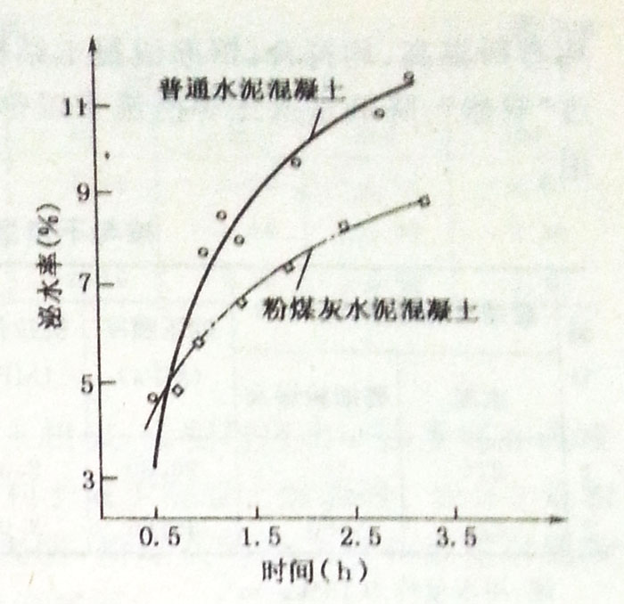 根據(jù)圖3—1所示,粉煤灰混凝土的總泌水率小于普通混凝土,說明粉煤灰土不易發(fā)生離析,有利于改善混凝土施工時的均勻性,提高混凝土的密實性和耐久性。