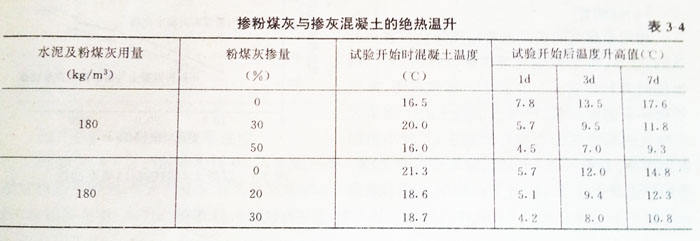 在大體積混凝土中,使用普通硅酸鹽水泥,由于水泥水化時硅酸三鈣(C3S)和鋁酸三鈣(C3A)作用發(fā)生熱量,Ig硅酸鹽水泥的總放熱量可達502J,因而導(dǎo)致混凝土溫度升高以至溫差收縮引起的裂縫。在普通混凝土中摻入粉煤灰后,水化熱明顯降低。表3—4是混凝土溫升狀況。由表列數(shù)據(jù)可知,摻30%粉煤灰與不摻粉煤灰的混凝土相比,絕熱溫升低27%~33%,較高溫升降低30%,并且可以減少或完全不需要人工冷卻措施。